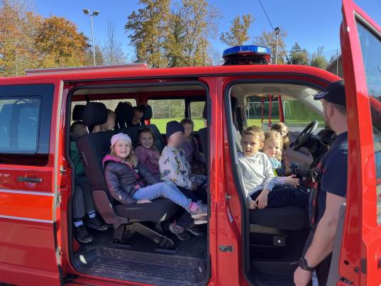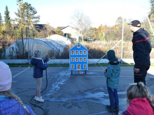 Die Kindergartenkinder erlebten unter der Leitung der Uetendorfer Feuerwehr einen interessanten und abwechslungsreichen Vormittag auf dem Schulgelände. An verschiedenen Stationen sammelten sie unterschiedliche Erfahrungen und durften sogar selber ein „brennendes“ Haus löschen.